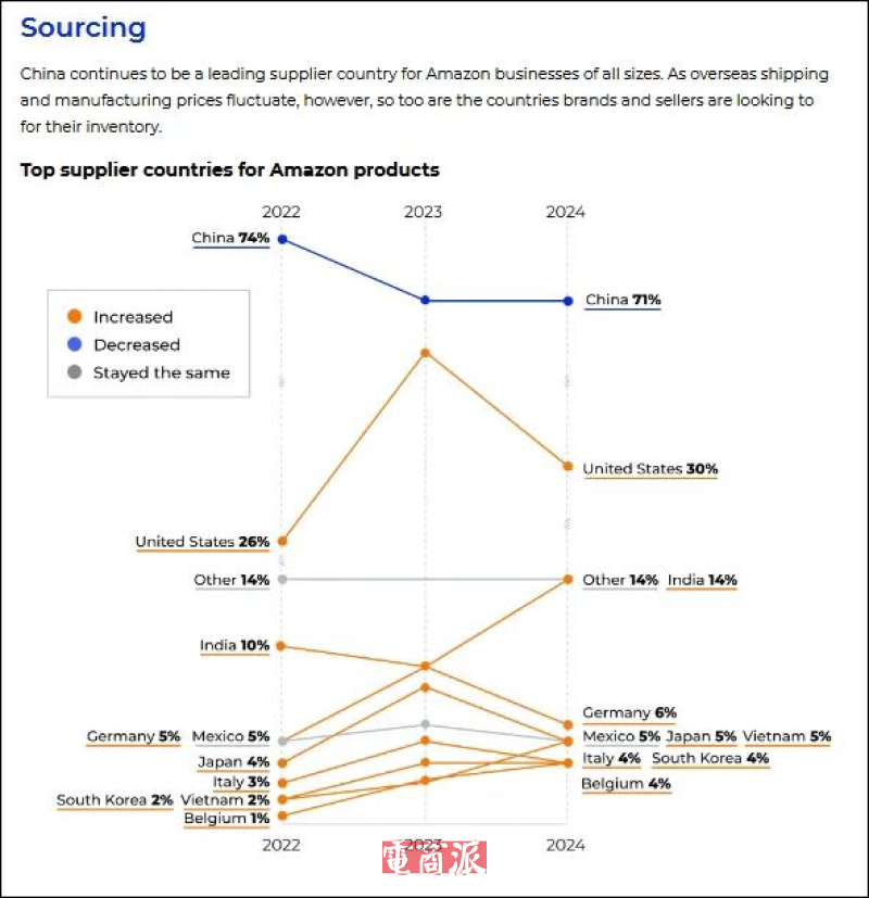 Jungle Scout之前發布的《2024亞馬遜賣家狀況報告》更是顯示,超過70%的亞馬遜賣家和品牌的貨源在中國,這一占比比排名第二、第三的美國和印度加起來還多。