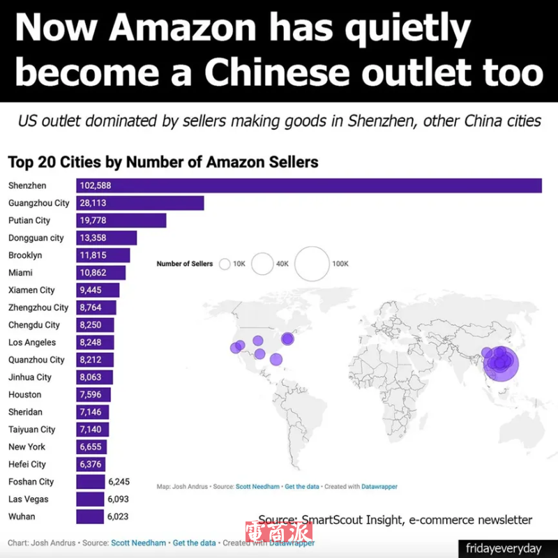報告數據顯示,在亞馬遜賣家數量排名前20的城市中,有13個都是中國城市,其中深圳更是以10.26萬的亞馬遜賣家規模,創下超過紐約與布魯克林總和6倍的紀錄。?
