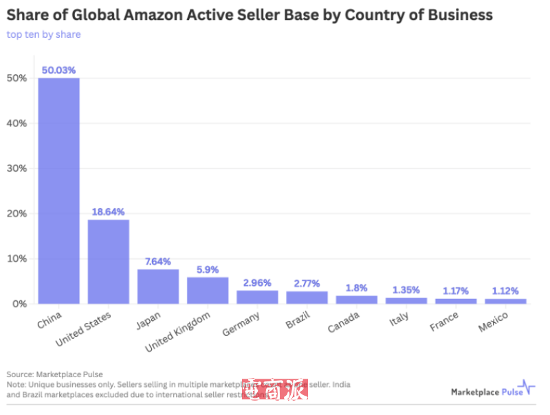 Marketplace Pulse最新數據顯示,中國賣家占亞馬遜全球活躍賣家基數達50.03%,首次超過半數,除日本外,中國賣家在各主要市場均為數量最多的賣家群體。
