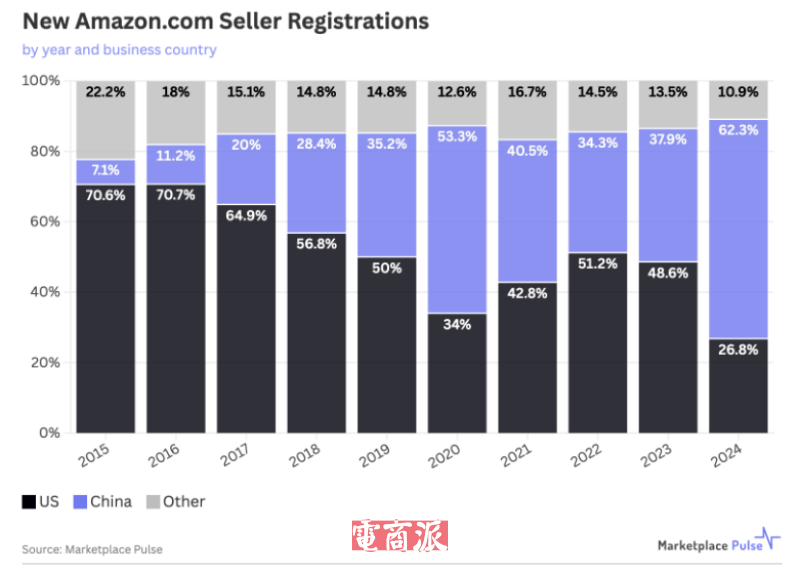 但經過十年的發展,這一格局發生了顛覆性變化:2024年新注冊賣家群體中,中國賣家占比飆升至62.3%,美國賣家則下滑至26.8%,攻守之勢徹底逆轉。