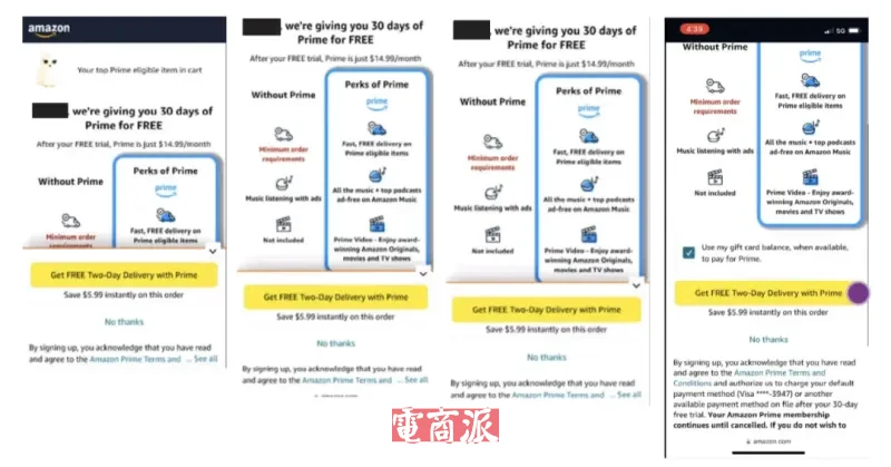 當時,FTC指控亞馬遜違反了《聯(lián)邦貿(mào)易委員會法案》和《恢復網(wǎng)上購物者信心法案》,因為亞馬遜使用了具有欺騙性的界面,誘導消費者在不知情的情況下注冊Prime會員。同時,亞馬遜增加了取消訂閱流程,以阻止或延遲消費者取消Prime會員服務。