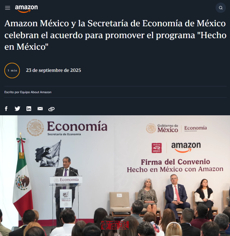 9月28日消息,亞馬遜近日與墨西哥經(jīng)濟部簽署合作協(xié)議,正式推動“墨西哥制造”(Hecho en México)計劃,旨在提高墨西哥制造產(chǎn)品在國內(nèi)外市場的知名度與銷售機會,拓展國際影響力,并為中小企業(yè)創(chuàng)造更多發(fā)展空間,推動企業(yè)數(shù)字化轉(zhuǎn)型。
