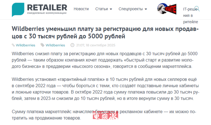 9月28日消息,Wildberries近日宣布對新入駐賣家大幅降低注冊門檻,并同步加快物流基礎設施建設,以適應即將到來的銷售旺季。根據(jù)新政策,注冊Wildberries合作伙伴平臺的新賣家需繳納的許可費從此前的3萬盧布下調(diào)至5000盧布。該費用用于驗證賣家的真實入駐意圖,同時全部轉(zhuǎn)化為廣告賬戶的推廣積分,賣家可用于商品宣傳。在獨聯(lián)體國家,相關費用將按當?shù)貐R率折算為等值金額。