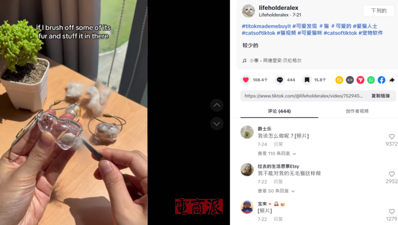 例如不久前在TikTok上,就有用戶將小貓掉落的毛發制成紀念吊飾,因精準擊中“情感留存”需求快速走紅,之后有捕捉到商機的商家商家同款產品也迅速賣爆。