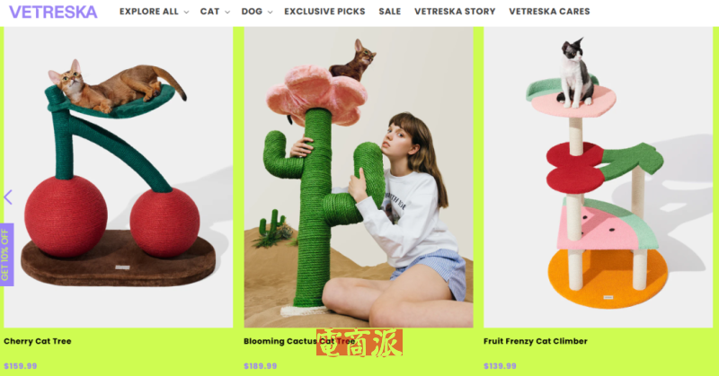 于是Vetreska便精準定位,從設計上通過創意化產品造型設計與產品顏色,融入草莓、櫻桃、仙人掌、花朵等元素,推出例如仙人掌貓爬架、西瓜貓砂盆等產品,既有實用性又迎合年輕消費者審美;在定價上Vetreska將產品定價鎖定在30-150美元區間,不僅匹配全球中產養寵群體的消費能力,恰好填補了市場空白。