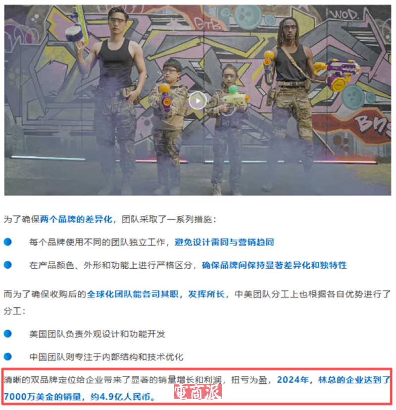 依靠品牌塑造和市場深耕,中州機械玩具槍很快在北美樹立起了牢固的品牌地位,數據顯示,2024年,林天強企業達到了7000萬美元的銷售額,折合人民幣約4.9億元。