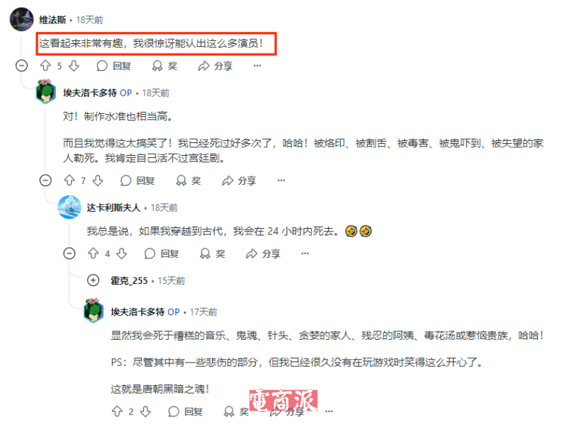 在海外社區(qū)平臺Reddit,就有中劇愛好者評論道,“這款游戲確實(shí)是為我制作的,我很高興我對C-Dramas(中?。┑牧私庹娴呐缮狭擞脠??!鄙踔吝€有用戶表示,游戲里的中國演員,很多都是熟面孔。
