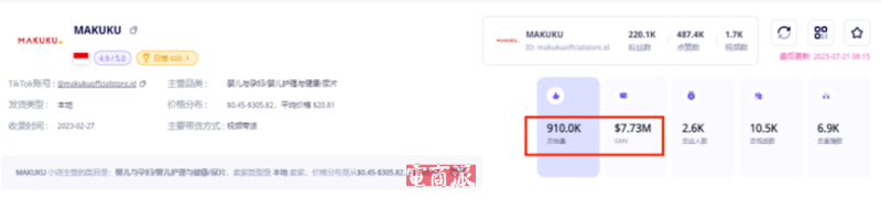 背靠如此龐大的市場,大批印尼賣家也成功實現業績增長,國產母嬰品牌MAKUKU就是其中之一。該品牌在2020年將目光放到印尼市場,在短短三年時間里成長為當地紙尿褲品牌Top3。三方平臺Echotik數據顯示,截至今年7月,MAKUKU印尼小店總銷量超過91萬件,累計銷售額超773萬美元。