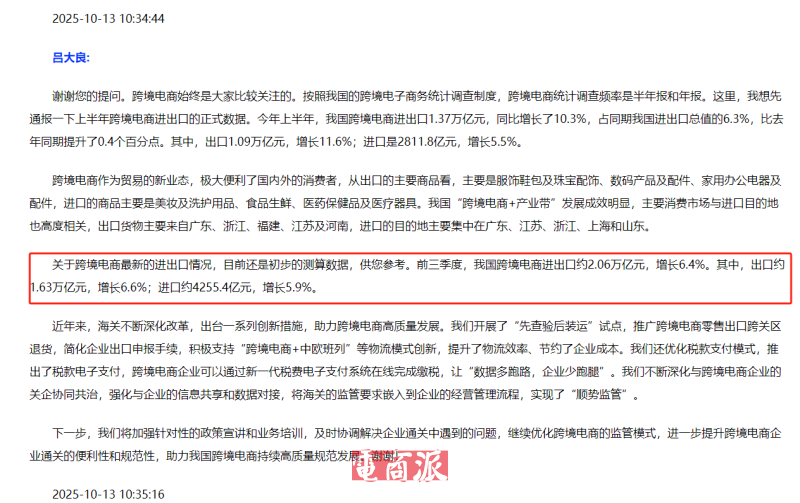 關于跨境電商最新的進出口情況,目前還是初步的測算數據。前三季度,我國跨境電商進出口約2.06萬億元,增長6.4%。其中,出口約1.63萬億元,增長6.6%;進口約4255.4億元,增長5.9%。