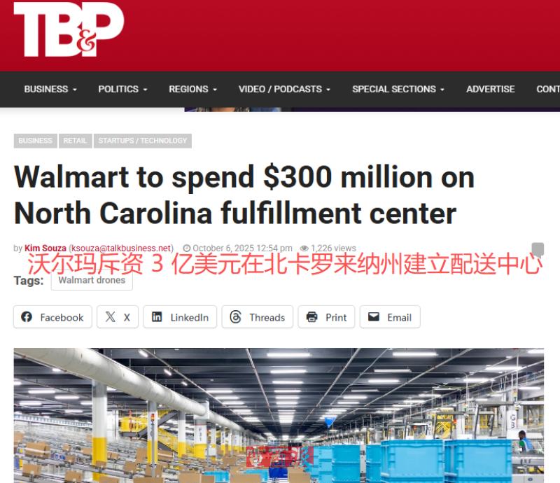 對于本次新建履約中心,沃爾瑪美國供應鏈高級副總裁卡麗莎·斯普拉格(Karisa Sprague)表示:“隨著我們電子商務業(yè)務的持續(xù)增長,這一新配送中心將在提升客戶服務效率方面發(fā)揮關(guān)鍵作用。”