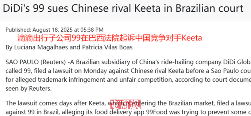 兩大巨頭狹路相逢,摩擦不可避免。僅今年八月,美團Keeta和滴滴99Food就在巴西爆發了三起官司糾紛,先是Keeta起訴99Food排他協議、資源截流,后99Food又反訴對方商標侵權、不正當競爭。