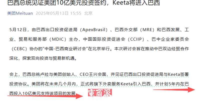 事實上,美團進軍巴西并不讓人意外。今年5月12日,在北京舉行的“中國-巴西商業研討會”上,美團創始人兼CEO王興就和巴西總統盧拉成功會面,美團旗下外賣品牌Keeta還與巴西出口投資促進局簽訂了投資協議,承諾將在未來幾個月內將外賣業務引入巴西市場。