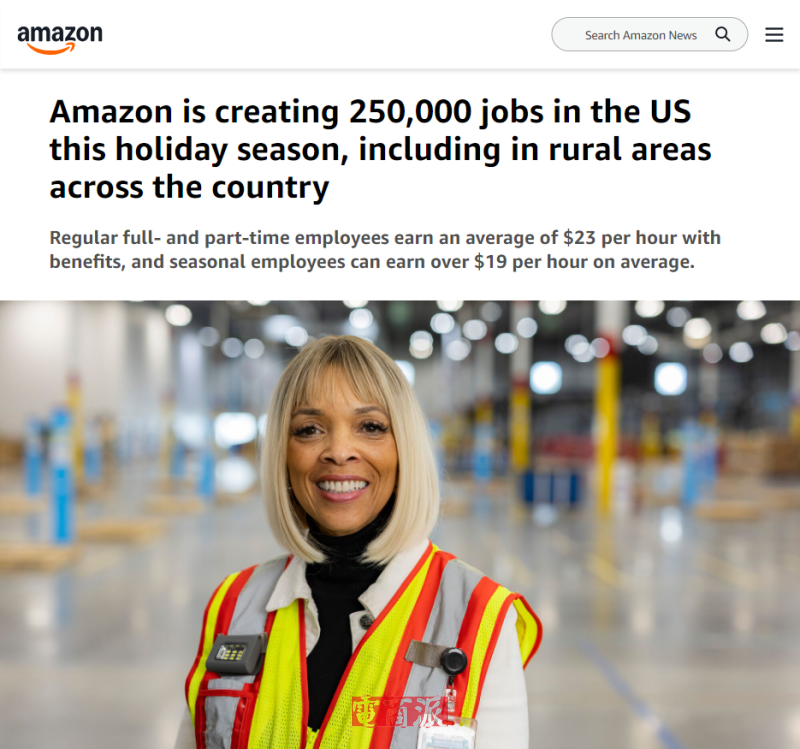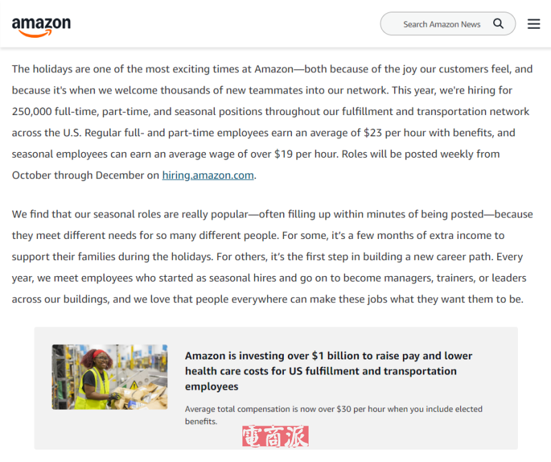 10月14日消息,亞馬遜計劃在美國的履約中心及運輸網絡中招聘25萬名假日季員工,招聘人數與過去兩年持平。目前該公司正為假日季訂單激增做準備。亞馬遜表示,此次招聘的全職及兼職員工時薪為23美元,且附帶福利;季節性員工的平均時薪則將超過19美元。