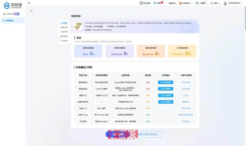 傳統(tǒng)合規(guī)模式在合規(guī)方案上存在局限,而LinkSafe調(diào)用AI合規(guī)引擎,1秒內(nèi)完成6大維度掃描(官方法規(guī)/知識(shí)產(chǎn)權(quán)/平臺(tái)政策/稅務(wù)合規(guī)/環(huán)保合規(guī)/產(chǎn)品檢測(cè)認(rèn)證),覆蓋220+國(guó)家/地區(qū)、12大品類,精準(zhǔn)命中10萬+法規(guī)條文、50萬+高風(fēng)險(xiǎn)關(guān)鍵詞,最多可檢測(cè)出10000+潛在風(fēng)險(xiǎn)點(diǎn)。