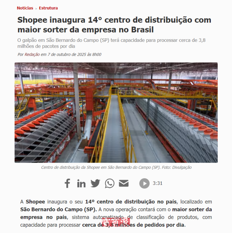 新設(shè)施位于圣保羅ABC地區(qū),地理位置優(yōu)越,便于連接主要消費(fèi)市場和交通干線。Shopee表示,該設(shè)備能通過自動化提升包裹分揀與出貨速度,從而顯著縮短訂單在倉內(nèi)停留時間,并加快送達(dá)終端消費(fèi)者的整體時效。