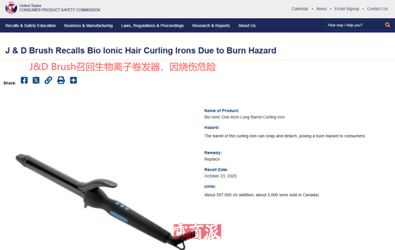 此次Bio Ionic電卷發棒召回事件,細節中藏著跨境電器產品的典型風險漏洞。產品召回原因是因加熱筒與手柄的連接結構不穩,長期使用后可能斷裂脫落,高溫組件直接接觸皮膚導致燙傷風險,觸發緊急召回。