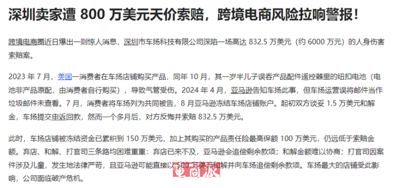 舉例來說,深圳車揚科技有限公司的遭遇便是行業刻骨銘心的教訓。2023年7月份,美國一消費者購買了車揚旗下一款產品,但該產品配件遙控器的紐扣電池不幸被家中幼兒誤吞,導致孩子氣管灼傷。