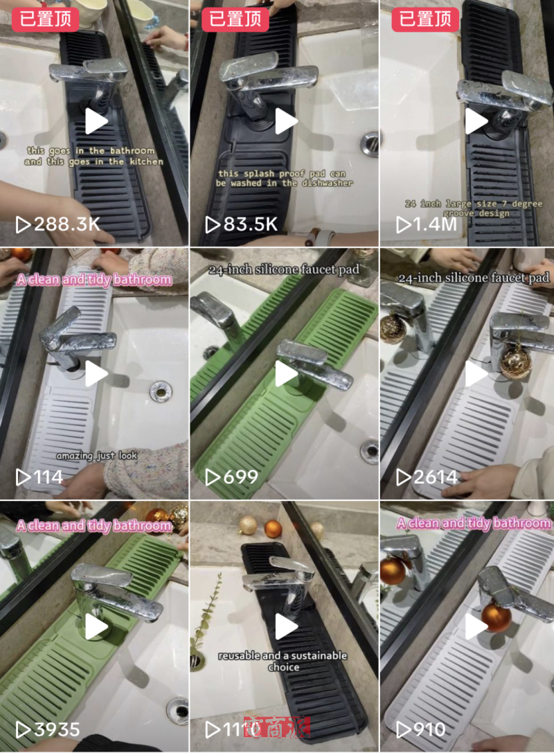 單拎產品來看,這款硅膠墊之所以能迅速出爆,關鍵在于它精準切中了消費者需求。據了解,這款硅膠墊實際作用是防濺水,放在洗手池靠墻面,可以減少用水后在臺面留下的水漬。有生活經驗的朋友應該都知道,洗手池靠墻面經常有積水,不好清潔且容易滋生細菌。這時候,硅膠墊的作用就顯而易見,能讓水順著往下流,不堆積在臺面上。