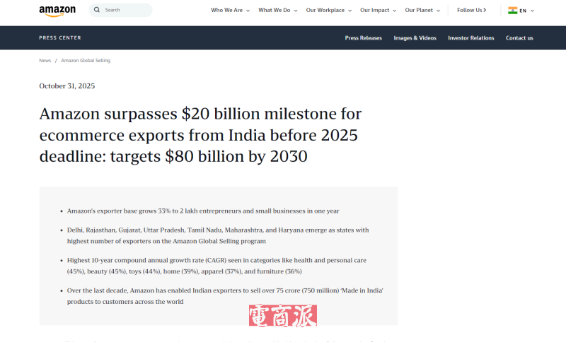 11月2日消息,亞馬遜近日披露,通過Amazon Global Selling項目,已幫助數十萬印度賣家在2015年至2025年間累計實現超過200億美元的印度電商出口額。2020年,亞馬遜曾承諾到2025年實現100億美元的印度電商出口額,后將目標調整為200億美元。如今,亞馬遜已提前完成其出口承諾。亞馬遜的旗艦電商出口項目——Amazon Global Selling于2015年啟動。過去十年間,該項目已注冊超過20萬家出口商,累計向全球消費者銷售超過7.5億件“印度制造”產品。過去一年,該項目的賣家數量增長超過33%。