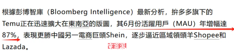 Temu東南亞月活用戶數量大漲 圖源:聯合早報