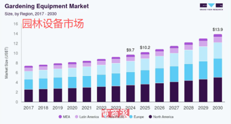 Grand View Research的數據顯示,2024年全球園藝設備市場規模約為968.6億美元,預計到2030年將達到1389億美元,復合年增長率達到6.3%。