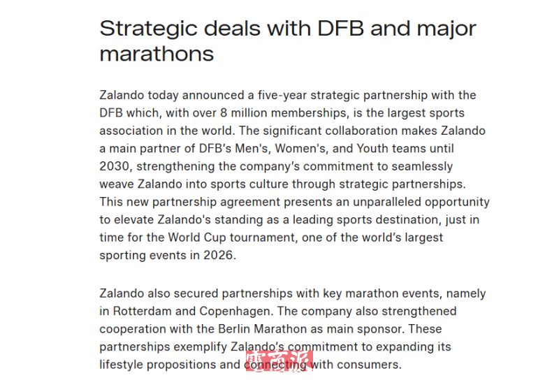 Zalando在體育領域的投入加速,本季度宣布與擁有逾800萬會員的德國足協(DFB)達成為期五年的戰略合作關系,合作覆蓋至2030年。Zalando還進一步加強在鹿特丹、哥本哈根和柏林等大型馬拉松賽事中的存在。這些合作將為Zalando體育品類帶來更高曝光和用戶滲透,為2026年世界杯前的用戶增長奠定基礎。