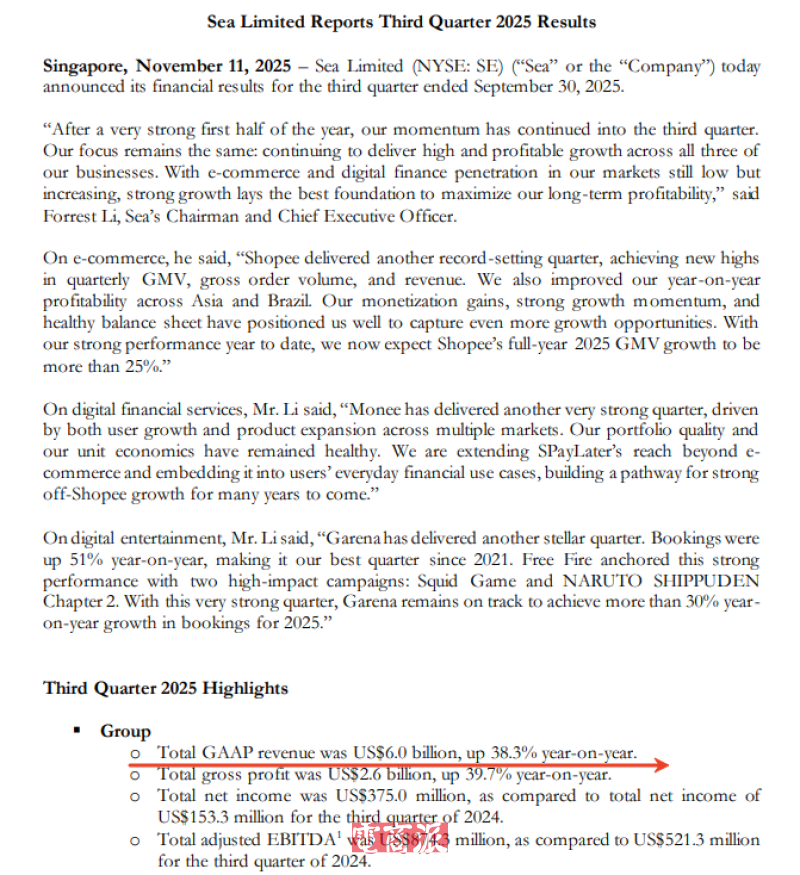 11月12日消息,Shopee母公司Sea Limited公布2025年第三季度財報。財報顯示,Sea三季度營收59.86億美元,同比增長38.3%;毛利潤為25.99億美元,同比增長39.7%;凈利潤實現3.75億美元,同比大幅增長144.6%。每股收益達0.59美元,增幅達145.8%。