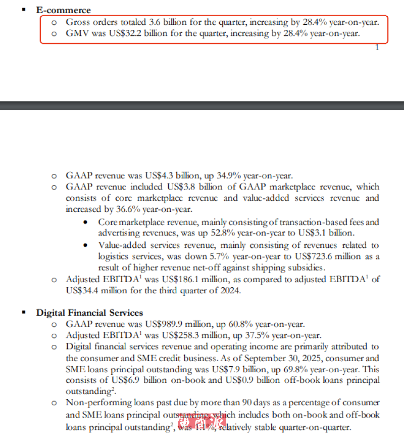 電商業務方面,Shopee三季度營收43億美元,同比增長35%;總訂單量為36億筆,同比增長28.4%;商品交易總額(GMV)為322億美元,同比增長28.4%;調整后EBITDA為1.86億美元,而2024年第三季度調整后EBITDA為3440萬美元。