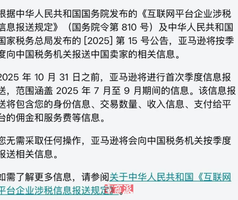 而在10月31日前,亞馬遜已進行首次季度消息報送,范圍覆蓋2025年7月至9月期間的涉稅信息,包括交易數量、收入信息、支付給平臺的傭金和服務費等信息。