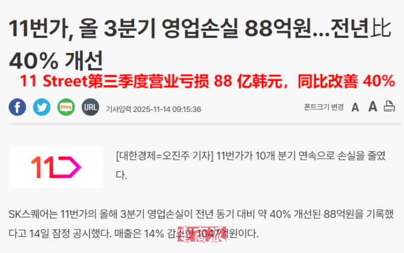 11 Street虧損大幅收窄 圖源:dnews.co.kr