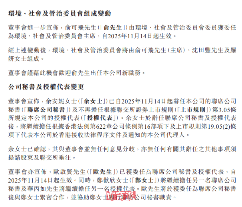 董事會宣布,余安妮已自2025年11月14日起辭任本公司的聯席公司秘書(「聯席公司秘書」)及不再擔任根據聯交所證券上市規則(「上市規則」)第3.05條所規定本公司的授權代表(「授權代表」)。余安妮于辭任聯席公司秘書及授權代表后,將繼續擔任根據香港法例第622章公司條例第16部項下及上市規則第19.05(2)條項下代表本公司于香港接收法律程序文件及通知的本公司代理人。