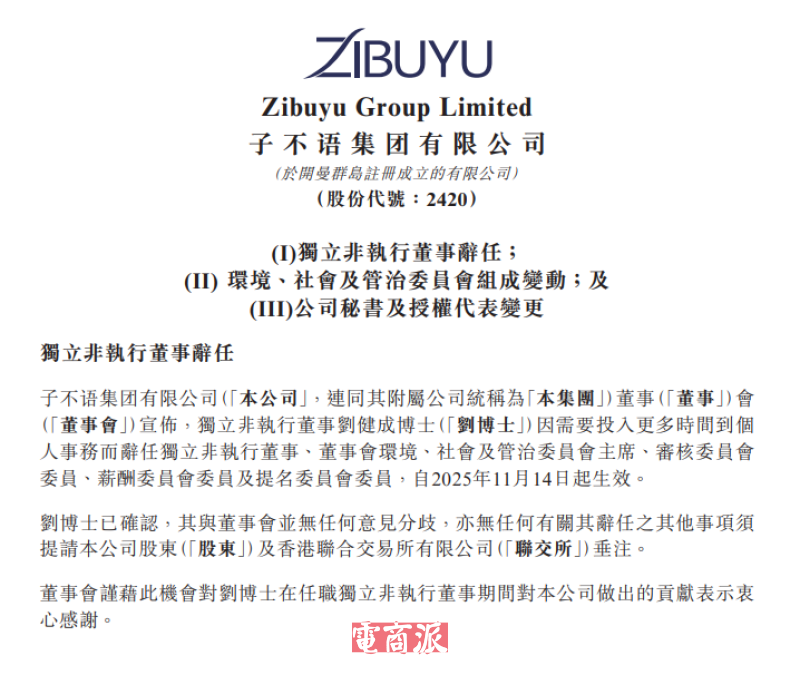11月17日消息,子不語宣布,獨立非執行董事劉健成博士因需要投入更多時間到個人事務而辭任獨立非執行董事、董事會環境、社會及管治委員會主席、審核委員會委員、薪酬委員會委員及提名委員會委員,自2025年11月14日起生效。
