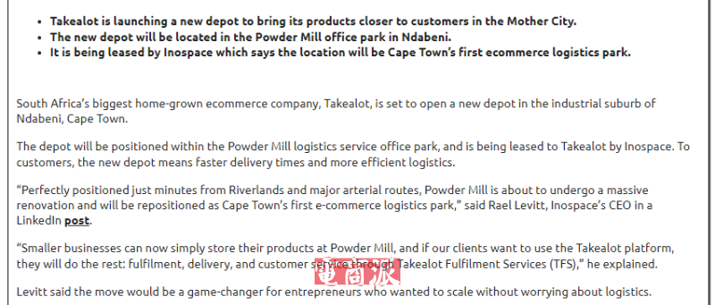 11月19日消息,南非電商平臺Takealot近日宣布,將在南非開普敦Ndabeni工業(yè)區(qū)啟用新倉儲樞紐,以拉近與當(dāng)?shù)叵M(fèi)者的距離并提升配送效率。該倉庫位于Powder Mill物流服務(wù)園區(qū),由Inospace對外出租,Powder Mill將在短期內(nèi)完成大規(guī)模改造,并成為開普敦首個電商物流園區(qū),為本地電商和中小企業(yè)提供倉儲與履約支持。