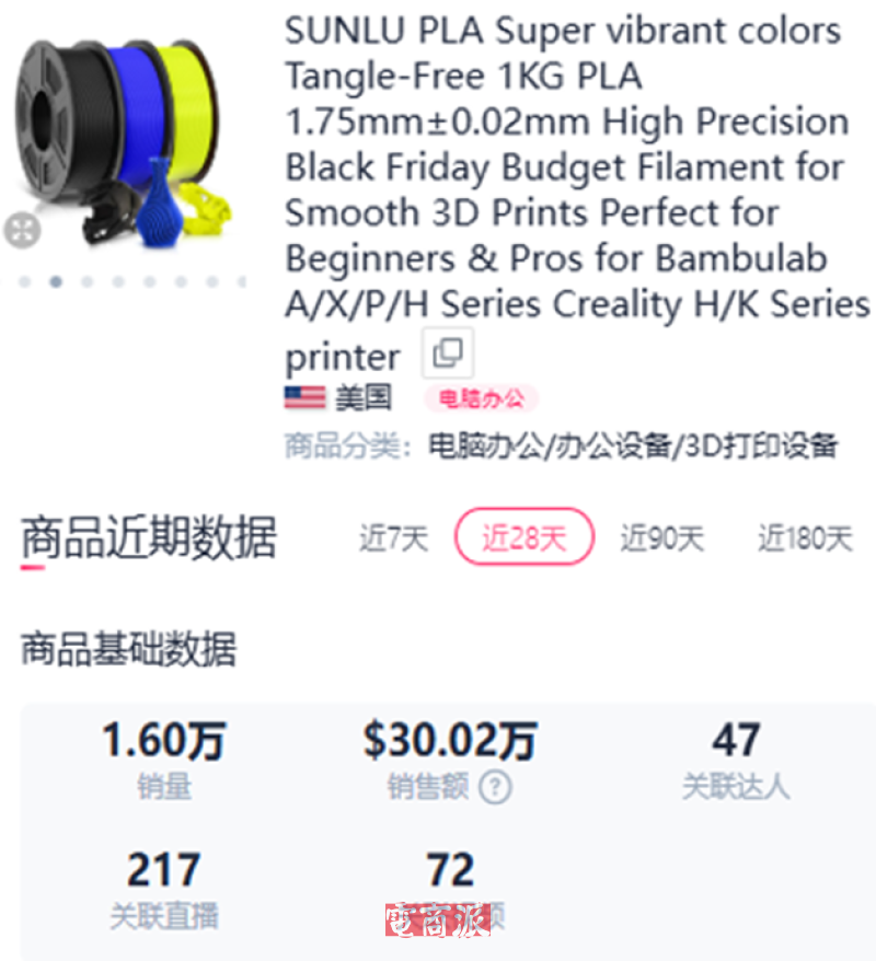 近期,TikTok美區的電腦辦公類目中,就有一款用于3D打印的PLA(聚乳酸)線材產品爆單。后臺數據顯示,其在近30天時間里售出了1.6萬件,銷售額達到30萬美元(約合人民幣213萬元)。