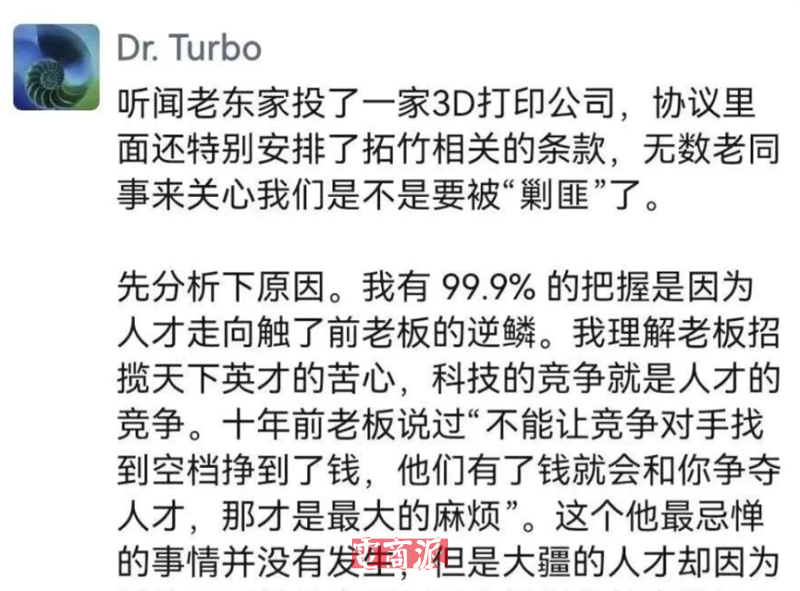 日前,3D打印機知名大賣——拓竹科技創始人陶冶在朋友圈發布了一篇千字小作文,矛頭直指老東家大疆:“聽聞老東家投了一家3D打印公司,協議里面還特別安排了拓竹相關的條款。”