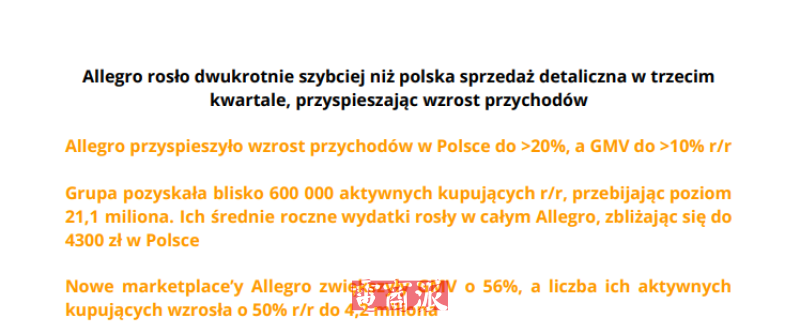 11月23日消息,Allegro近日發布了2025年第三季度的財務報告,本季度在波蘭市場繼續保持遠高于行業水平的增長速度,收入增速超過20%,平臺GMV增長超過10%。