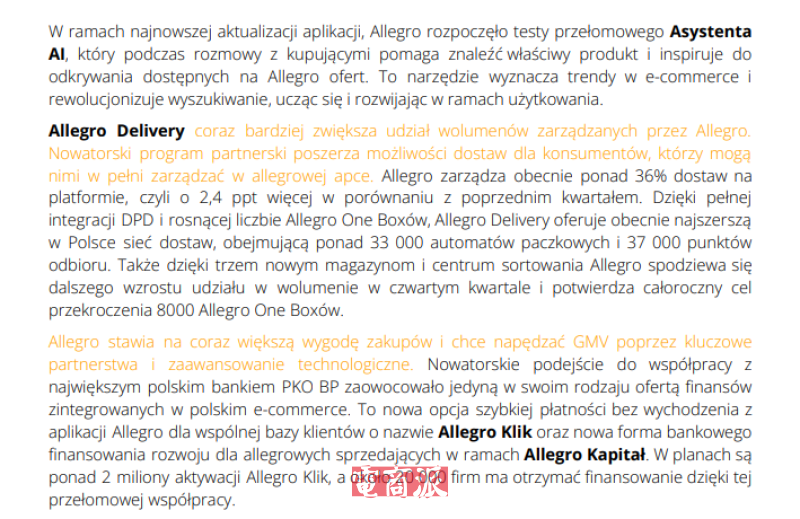 在金融方面,Allegro與波蘭最大銀行PKO BP達成創新合作,推出嵌入式快速支付方式Allegro Klik,目標激活超過200萬客戶,并推出了面向商家的新融資渠道Allegro Kapita?,預計支持20,000家企業。