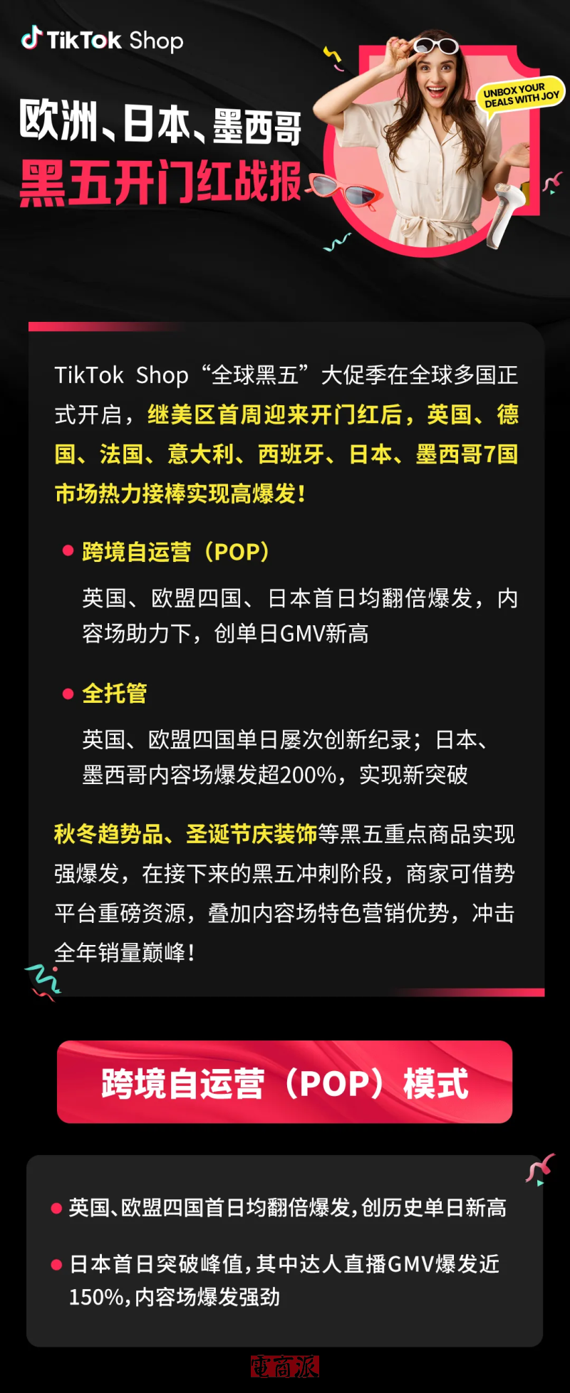 在跨境自運營(POP)模式方面,表現最突出的來自歐洲與日本市場。英國、德國、法國、意大利、西班牙五國在大促首日整體實現GMV倍增,創下歷史單日新高,顯示出平臺在歐美消費季的滲透率進一步提升。與此同時,日本市場也在開局階段突破以往峰值,其中達人直播帶貨的GMV增長近150%,用戶消費活躍度顯著攀升。