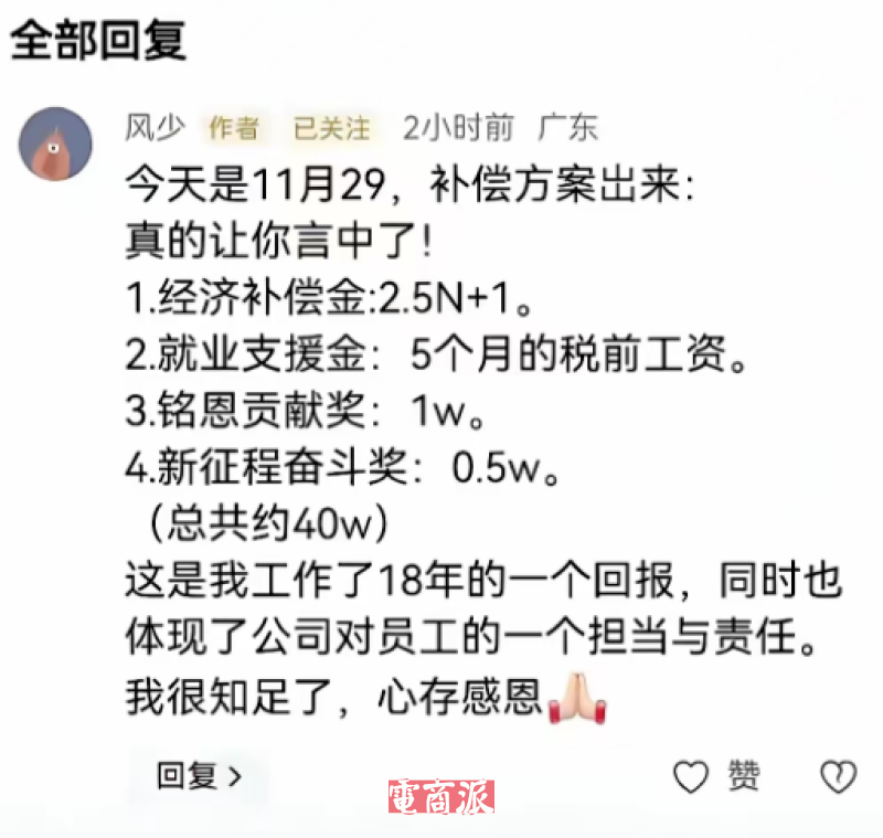 在社交平臺上也有自稱是18年老員工爆料稱,企業(yè)給出的賠償方案包括2.5N+1的賠償金、5個月稅前工資就業(yè)支援金,再加上各種獎金能拿到約40萬元,并表示“很知足了,心存感恩。”