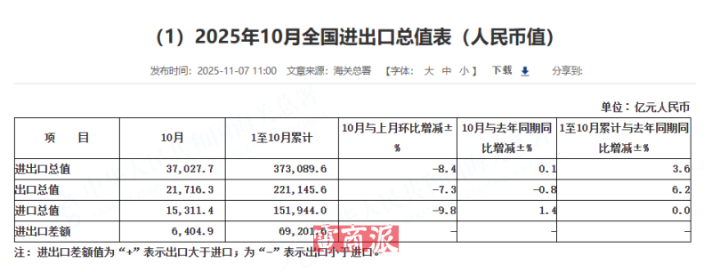 不久前,我國海關(guān)總署公布了截至今年10份的進出口數(shù)據(jù)。數(shù)據(jù)顯示,2025年前10個月,我國進出口總值37.31萬億元人民幣,同比增長3.6%,其中出口22.12萬億元,增長6.2%;進口15.19萬億元,與去年同期基本持平。