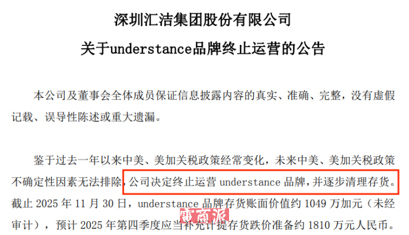 據Understance母公司深圳匯潔集團股份發布的公告,Understance之所以走向關閉的結局,原因主要在于市場不確定性因素干擾太大。過去一年,中美、美加關稅政策持續變化,由此引發的市場變化難以捉摸。如此背景下,與其硬著頭皮闖下去,不如適時剎車,避免更大損失。