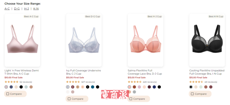 據了解,Understance成立于2021年,核心市場定于北美;品牌理念強調包容性,產品尺碼覆蓋28-48碼(美碼)和AN罩杯的149種尺碼;價格定位在中高端市場,多數內衣價格在59美元-72美元之間,睡衣和家居服系列起價約45美元。