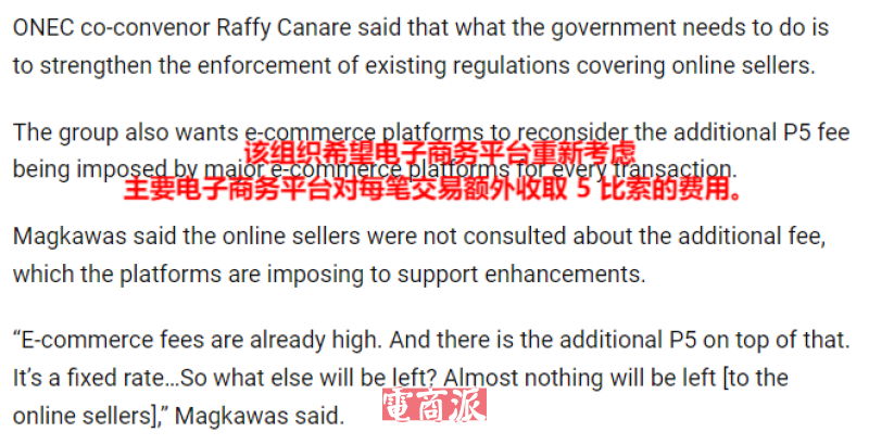 前段時(shí)間,菲律賓全國(guó)性組織“在線創(chuàng)業(yè)賦能社區(qū)”(ONEC)就代表中小賣家提起投訴,呼吁政府管理日益加重的電商平臺(tái)收費(fèi)現(xiàn)象。其中,ONEC明確表示,應(yīng)該將平臺(tái)基礎(chǔ)設(shè)施費(fèi)/訂單處理費(fèi)從5比索降至1比索,以減輕賣家成本負(fù)擔(dān)。